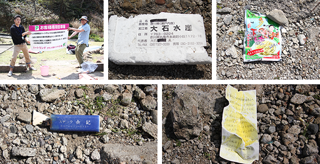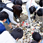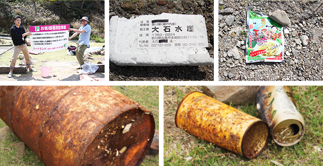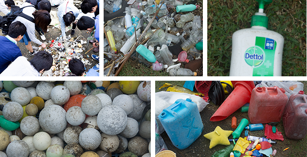 一般生活で消費される、ペットボトルや食品の包装ビニール、発泡スチロール容器(カップラーメンやトレイなど)などのプラスチック製品が多く見られます。海岸の漂着ごみは地下層にまで堆積しており、海岸の土を掘り起こすと大量のごみが掘り起こされます。長年の堆積により海岸の土の層にもかなりのごみが埋まっていると考えられます。